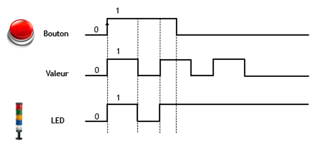 En mode non-cyclique, il y aura une valeur (ici, le bouton) qui va décider d’activer ou non la communication. Lorsqu’elle est active, elle fonctionne comme en mode cyclique. Lorsqu’elle est désactivée, la communication s’arrête et la valeur va se figer. La LED va donc rester allumer jusqu’à l’ordre d’arrêt.